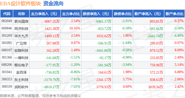从资金流向上来看,当日EDA设计软件板块主力资金净流出3722.51万元,游资资金净流出850.38万元,散户资金净流入4572.89万元。EDA设计软件板块个股资金流向见下表: