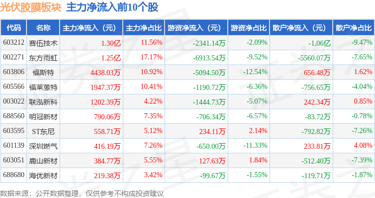 从资金流向上来看,当日光伏胶膜板块主力资金净流出2.43亿元,游资资金净流出2.69亿元,散户资金净流入5.11亿元。光伏胶膜板块个股资金流向见下表: