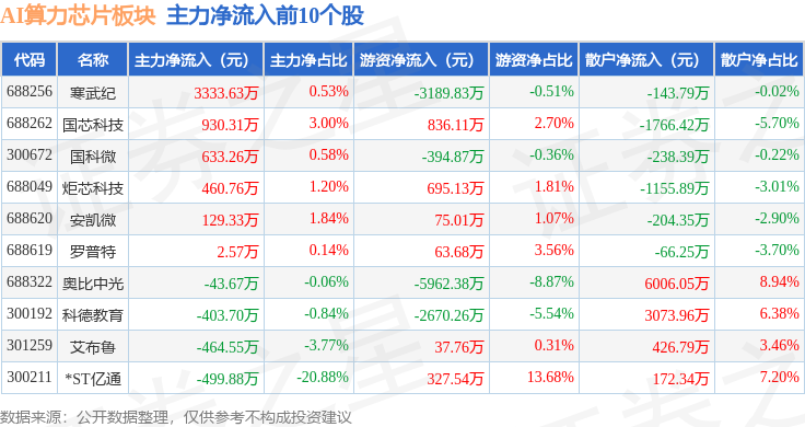 从资金流向上来看,当日AI算力芯片板块主力资金净流出27.67亿元,游资资金净流入10.81亿元,散户资金净流入16.86亿元。AI算力芯片板块个股资金流向见下表: