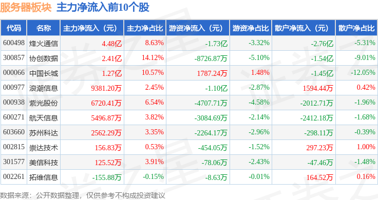 从资金流向上来看,当日服务器板块主力资金净流出31.45亿元,游资资金净流入6.05亿元,散户资金净流入25.4亿元。服务器板块个股资金流向见下表: