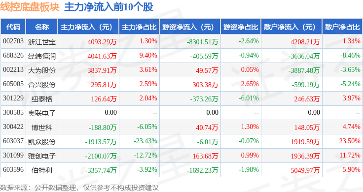 从资金流向上来看,当日线控底盘板块主力资金净流出2.34亿元,游资资金净流出1.12亿元,散户资金净流入3.46亿元。线控底盘板块个股资金流向见下表: