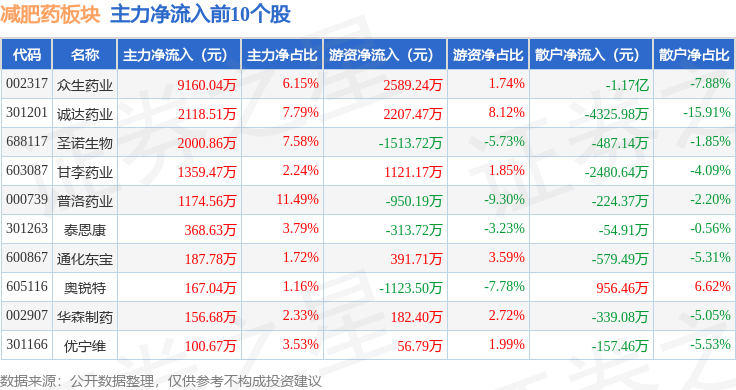从资金流向上来看,当日减肥药板块主力资金净流出4.46亿元,游资资金净流入4194.21万元,散户资金净流入4.04亿元。减肥药板块个股资金流向见下表: