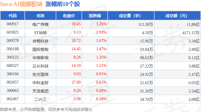证券之星消息,12月26日Sora/AI视频板块较上一交易日上涨0.19%,电广传媒领涨。当日上证指数报收于3963.68,上涨0.1%。深证成指报收于13603.89,上涨0.54%。Sora/AI视频板块个股涨跌见下表: