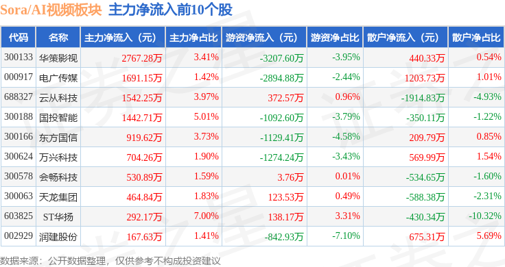 从资金流向上来看,当日Sora/AI视频板块主力资金净流出3.44亿元,游资资金净流出5651.56万元,散户资金净流入4.01亿元。Sora/AI视频板块个股资金流向见下表: