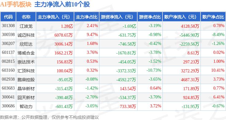 从资金流向上来看,当日AI手机板块主力资金净流出22.2亿元,游资资金净流出1146.4万元,散户资金净流入22.31亿元。AI手机板块个股资金流向见下表: