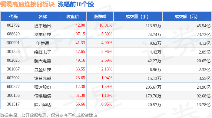 从资金流向上来看,当日铜缆高速连接器板块主力资金净流出17.67亿元,游资资金净流出5247.05万元,散户资金净流入18.19亿元。铜缆高速连接器板块个股资金流向见下表: