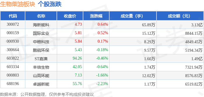 证券之星消息,12月26日生物柴油板块较上一交易日下跌0.33%,卓越新能领跌。当日上证指数报收于3963.68,上涨0.1%。深证成指报收于13603.89,上涨0.54%。生物柴油板块个股涨跌见下表: