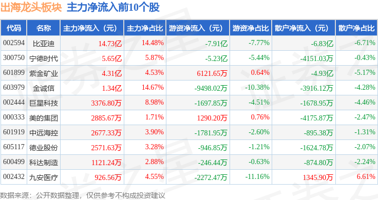 从资金流向上来看,当日出海龙头板块主力资金净流出50.89亿元,游资资金净流入29.33亿元,散户资金净流入21.56亿元。出海龙头板块个股资金流向见下表: