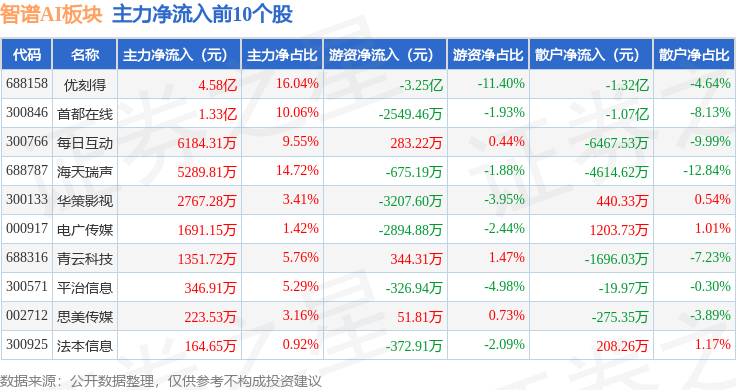 从资金流向上来看,当日智谱AI板块主力资金净流出8.75亿元,游资资金净流出293.98万元,散户资金净流入8.78亿元。智谱AI板块个股资金流向见下表: