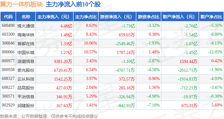 从资金流向上来看,当日算力一体机板块主力资金净流出11.98亿元,游资资金净流入8.49亿元,散户资金净流入3.49亿元。算力一体机板块个股资金流向见下表: