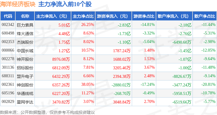 从资金流向上来看,当日海洋经济板块主力资金净流出18.1亿元,游资资金净流出1.15亿元,散户资金净流入19.25亿元。海洋经济板块个股资金流向见下表: