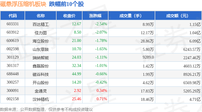 证券之星消息,12月26日磁悬浮压缩机板块较上一交易日上涨0.85%,雪人集团领涨。当日上证指数报收于3963.68,上涨0.1%。深证成指报收于13603.89,上涨0.54%。磁悬浮压缩机板块个股涨跌见下表: