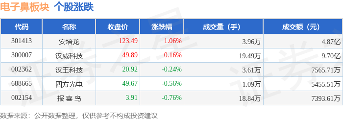 证券之星消息,12月26日电子鼻板块较上一交易日上涨0.07%,安培龙领涨。当日上证指数报收于3963.68,上涨0.1%。深证成指报收于13603.89,上涨0.54%。电子鼻板块个股涨跌见下表: