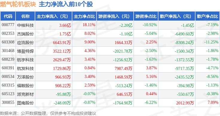 从资金流向上来看,当日燃气轮机板块主力资金净流入2.68亿元,游资资金净流出3.62亿元,散户资金净流入9460.38万元。燃气轮机板块个股资金流向见下表: