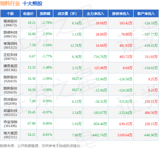 个股表现方面,饲料行业当日领跌股为佩蒂股份(300673),该股当日报收18.21,下跌2.78%,成交量6.54万,主力资金净流入20.68万元。路德科技(688156)以下跌1.95%紧随其后,该股当日成交量1.13万,主力资金净流入28.89万元。除此之外,粤海饲料(001313)、正虹科技(000702)、播恩集团(001366)均进入当日熊股之列。具体个股列表见下表: