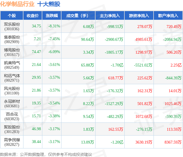 个股表现方面,化学制品行业当日领跌股为双乐股份(301036),该股当日报收34.75,下跌8.31%,成交量6.08万,主力资金净流出998.55万元。集泰股份(002909)以下跌7.45%紧随其后,该股当日成交量90.64万,主力资金净流出2900.67万元。除此之外,博苑股份(301617)、凯美特气(002549)、和远气体(002971)均进入当日熊股之列。具体个股列表见下表: