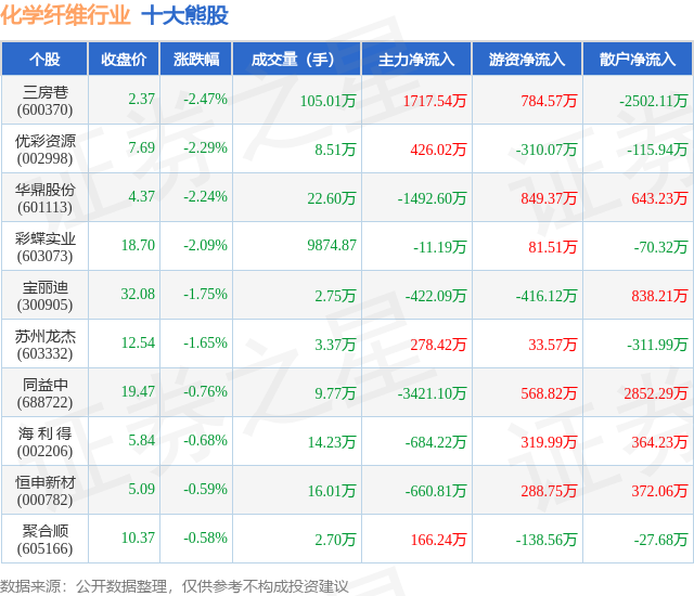 个股表现方面,化学纤维行业当日领跌股为三房巷(600370),该股当日报收2.37,下跌2.47%,成交量105.01万,主力资金净流入1717.54万元。优彩资源(002998)以下跌2.29%紧随其后,该股当日成交量8.51万,主力资金净流入426.02万元。除此之外,华鼎股份(601113)、彩蝶实业(603073)、宝丽迪(300905)均进入当日熊股之列。具体个股列表见下表: