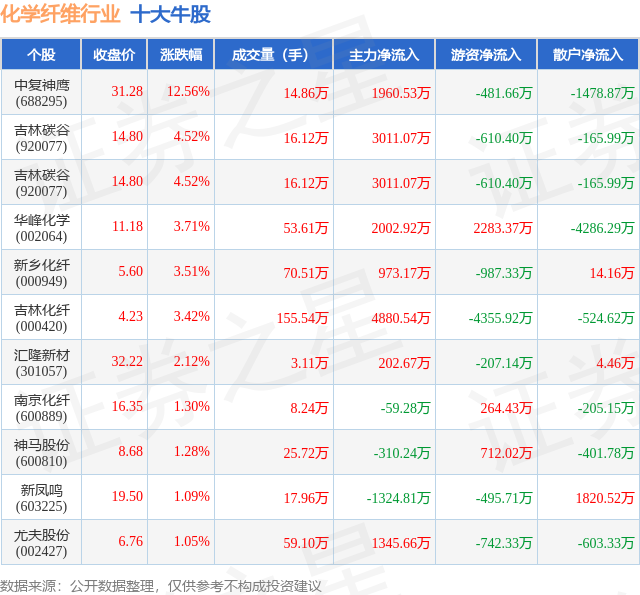 个股表现方面,化学纤维行业当日领涨股为中复神鹰(688295),该股当日报收31.28,上涨12.56%,成交量14.86万,主力资金净流入1960.53万元。吉林碳谷(920077)以上涨4.52%紧随其后,该股当日成交量16.12万,主力资金净流入3011.07万元。除此之外,吉林碳谷(920077)、华峰化学(002064)、新乡化纤(000949)均进入当日牛股之列。具体个股列表见下表: