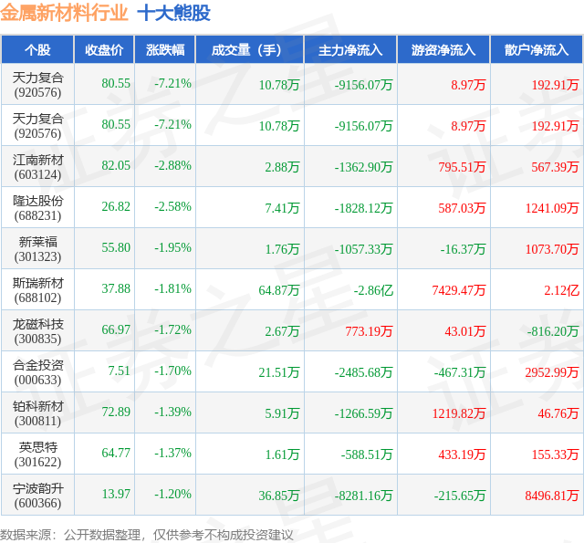 个股表现方面,金属新材料行业当日领跌股为天力复合(920576),该股当日报收80.55,下跌7.21%,成交量10.78万,主力资金净流出9156.07万元。天力复合(920576)以下跌7.21%紧随其后,该股当日成交量10.78万,主力资金净流出9156.07万元。除此之外,江南新材(603124)、隆达股份(688231)、新莱福(301323)均进入当日熊股之列。具体个股列表见下表: