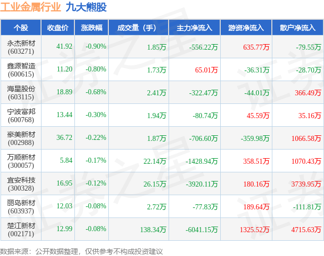 个股表现方面,工业金属行业当日领跌股为永杰新材(603271),该股当日报收41.92,下跌0.9%,成交量1.85万,主力资金净流出556.22万元。鑫源智造(600615)以下跌0.8%紧随其后,该股当日成交量1.73万,主力资金净流入65.01万元。除此之外,海星股份(603115)、宁波富邦(600768)、豪美新材(002988)均进入当日熊股之列。具体个股列表见下表: