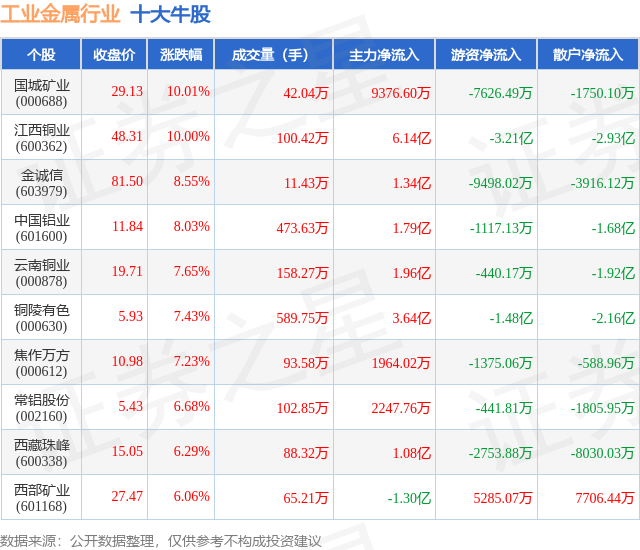 个股表现方面,工业金属行业当日领涨股为国城矿业(000688),该股当日报收29.13,上涨10.01%,成交量42.04万,主力资金净流入9376.6万元。江西铜业(600362)以上涨10.0%紧随其后,该股当日成交量100.42万,主力资金净流入6.14亿元。除此之外,金诚信(603979)、中国铝业(601600)、云南铜业(000878)均进入当日牛股之列。具体个股列表见下表: