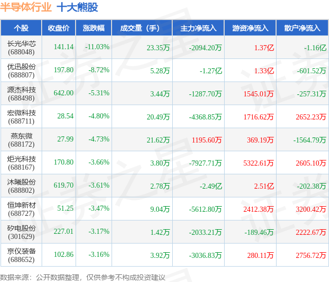 个股表现方面,半导体行业当日领跌股为长光华芯(688048),该股当日报收141.14,下跌11.03%,成交量23.35万,主力资金净流出2094.2万元。优迅股份(688807)以下跌8.72%紧随其后,该股当日成交量5.28万,主力资金净流出1.27亿元。除此之外,源杰科技(688498)、宏微科技(688711)、燕东微(688172)均进入当日熊股之列。具体个股列表见下表: