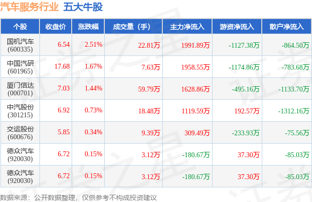个股表现方面,汽车服务行业当日领涨股为国机汽车(600335),该股当日报收6.54,上涨2.51%,成交量22.81万,主力资金净流入1991.89万元。中国汽研(601965)以上涨1.67%紧随其后,该股当日成交量7.63万,主力资金净流入1958.55万元。除此之外,厦门信达(000701)、中汽股份(301215)、交运股份(600676)均进入当日牛股之列。具体个股列表见下表: