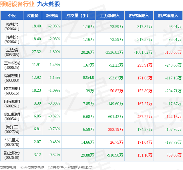 个股表现方面,照明设备行业当日领跌股为格利尔(920641),该股当日报收18.4,下跌2.08%,成交量1.16万,主力资金净流出73.59万元。格利尔(920641)以下跌2.08%紧随其后,该股当日成交量1.16万,主力资金净流出73.59万元。除此之外,立达信(605365)、三雄极光(300625)、得邦照明(603303)均进入当日熊股之列。具体个股列表见下表: