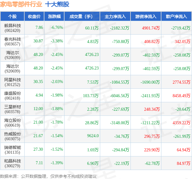 个股表现方面,家电零部件行业当日领跌股为毅昌科技(002420),该股当日报收7.86,下跌6.76%,成交量60.11万,主力资金净流出2182.32万元。春光科技(603657)以下跌3.38%紧随其后,该股当日成交量4.83万,主力资金净流出750.88万元。除此之外,海达尔(920699)、海达尔(920699)、同星科技(301252)均进入当日熊股之列。具体个股列表见下表: