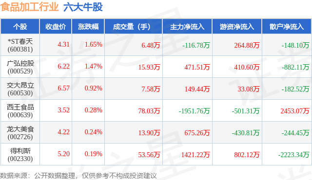 个股表现方面,食品加工行业当日领涨股为*ST春天(600381),该股当日报收4.31,上涨1.65%,成交量6.48万,主力资金净流出116.78万元。广弘控股(000529)以上涨1.47%紧随其后,该股当日成交量15.93万,主力资金净流入471.51万元。除此之外,交大昂立(600530)、西王食品(000639)、龙大美食(002726)均进入当日牛股之列。具体个股列表见下表: