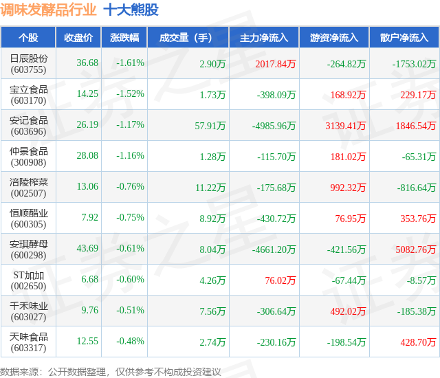 个股表现方面,调味发酵品行业当日领跌股为日辰股份(603755),该股当日报收36.68,下跌1.61%,成交量2.9万,主力资金净流入2017.84万元。宝立食品(603170)以下跌1.52%紧随其后,该股当日成交量1.73万,主力资金净流出398.09万元。除此之外,安记食品(603696)、仲景食品(300908)、涪陵榨菜(002507)均进入当日熊股之列。具体个股列表见下表: