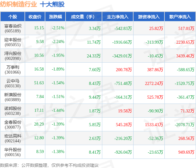 个股表现方面,纺织制造行业当日领跌股为富春染织(605189),该股当日报收15.15,下跌2.51%,成交量3.34万,主力资金净流出542.83万元。迎丰股份(605055)以下跌2.24%紧随其后,该股当日成交量11.74万,主力资金净流出1916.66万元。除此之外,浔兴股份(002098)、万事利(301066)、云中马(603130)均进入当日熊股之列。具体个股列表见下表: