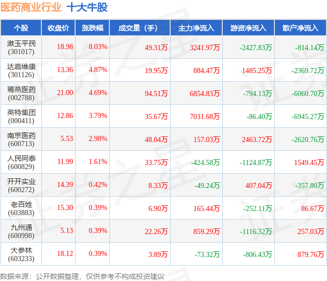 个股表现方面,医药商业行业当日领涨股为漱玉平民(301017),该股当日报收18.98,上涨8.03%,成交量49.31万,主力资金净流入3241.97万元。达嘉维康(301126)以上涨4.87%紧随其后,该股当日成交量19.95万,主力资金净流入884.47万元。除此之外,鹭燕医药(002788)、英特集团(000411)、南京医药(600713)均进入当日牛股之列。具体个股列表见下表: