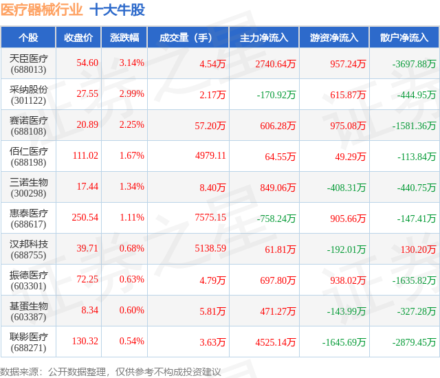 个股表现方面,医疗器械行业当日领涨股为天臣医疗(688013),该股当日报收54.6,上涨3.14%,成交量4.54万,主力资金净流入2740.64万元。采纳股份(301122)以上涨2.99%紧随其后,该股当日成交量2.17万,主力资金净流出170.92万元。除此之外,赛诺医疗(688108)、佰仁医疗(688198)、三诺生物(300298)均进入当日牛股之列。具体个股列表见下表: