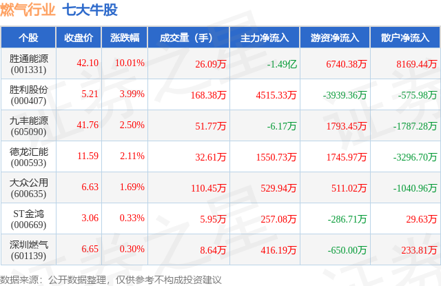 个股表现方面,燃气行业当日领涨股为胜通能源(001331),该股当日报收42.1,上涨10.01%,成交量26.09万,主力资金净流出1.49亿元。胜利股份(000407)以上涨3.99%紧随其后,该股当日成交量168.38万,主力资金净流入4515.33万元。除此之外,九丰能源(605090)、德龙汇能(000593)、大众公用(600635)均进入当日牛股之列。具体个股列表见下表: