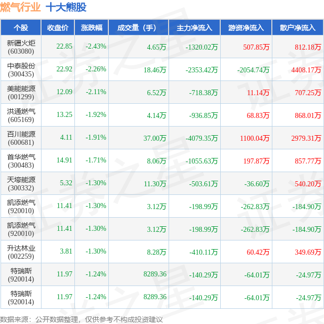 个股表现方面,燃气行业当日领跌股为新疆火炬(603080),该股当日报收22.85,下跌2.43%,成交量4.65万,主力资金净流出1320.02万元。中泰股份(300435)以下跌2.26%紧随其后,该股当日成交量18.46万,主力资金净流出2353.42万元。除此之外,美能能源(001299)、洪通燃气(605169)、百川能源(600681)均进入当日熊股之列。具体个股列表见下表: