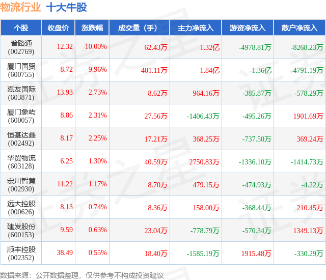 个股表现方面,物流行业当日领涨股为普路通(002769),该股当日报收12.32,上涨10.0%,成交量62.43万,主力资金净流入1.32亿元。厦门国贸(600755)以上涨9.96%紧随其后,该股当日成交量401.11万,主力资金净流入1.84亿元。除此之外,嘉友国际(603871)、厦门象屿(600057)、恒基达鑫(002492)均进入当日牛股之列。具体个股列表见下表: