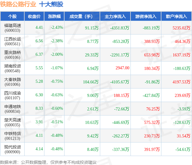 个股表现方面,铁路公路行业当日领跌股为福建高速(600033),该股当日报收4.41,下跌2.43%,成交量91.15万,主力资金净流出4351.83万元。江西长运(600561)以下跌2.38%紧随其后,该股当日成交量8.77万,主力资金净流出853.28万元。除此之外,重庆路桥(600106)、湖南投资(000548)、大秦铁路(601006)均进入当日熊股之列。具体个股列表见下表: