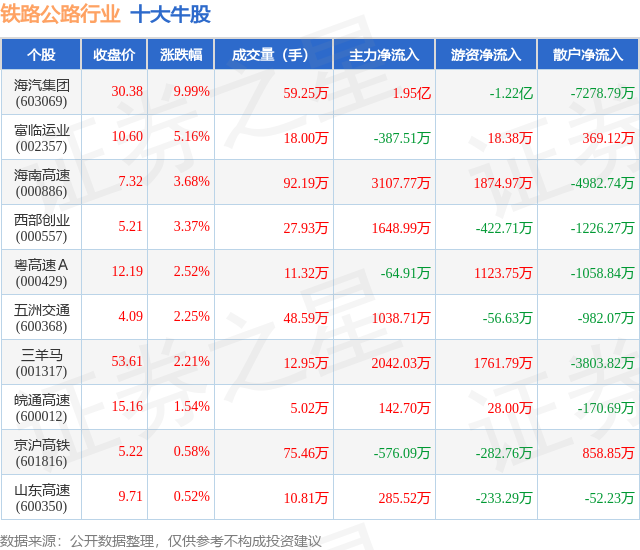 个股表现方面,铁路公路行业当日领涨股为海汽集团(603069),该股当日报收30.38,上涨9.99%,成交量59.25万,主力资金净流入1.95亿元。富临运业(002357)以上涨5.16%紧随其后,该股当日成交量18.0万,主力资金净流出387.51万元。除此之外,海南高速(000886)、西部创业(000557)、粤高速A(000429)均进入当日牛股之列。具体个股列表见下表: