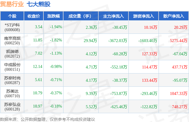 个股表现方面,贸易行业当日领跌股为*ST沪科(600608),该股当日报收3.54,下跌1.94%,成交量2.36万,主力资金净流出30.45万元。南京商旅(600250)以下跌1.82%紧随其后,该股当日成交量29.94万,主力资金净流出3672.03万元。除此之外,凯瑞德(002072)、中成股份(000151)、苏豪时尚(600287)均进入当日熊股之列。具体个股列表见下表: