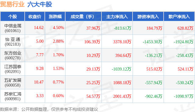 个股表现方面,贸易行业当日领涨股为中信金属(601061),该股当日报收14.62,上涨4.5%,成交量37.96万,主力资金净流出813.61万元。怡 亚 通(002183)以上涨2.88%紧随其后,该股当日成交量106.39万,主力资金净流入3378.1万元。除此之外,东方创业(600278)、江苏国泰(002091)、五矿发展(600058)均进入当日牛股之列。具体个股列表见下表: