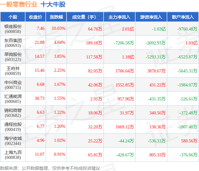个股表现方面,一般零售行业当日领涨股为银座股份(600858),该股当日报收7.46,上涨10.03%,成交量64.76万,主力资金净流入2.01亿元。东百集团(600693)以上涨4.64%紧随其后,该股当日成交量189.18万,主力资金净流出7206.58万元。除此之外,翠微股份(603123)、王府井(600859)、中兴商业(000715)均进入当日牛股之列。具体个股列表见下表: