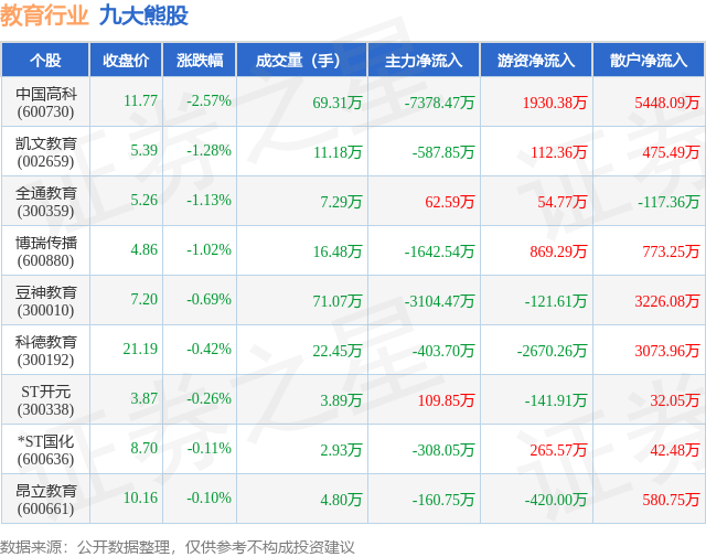 个股表现方面,教育行业当日领跌股为中国高科(600730),该股当日报收11.77,下跌2.57%,成交量69.31万,主力资金净流出7378.47万元。凯文教育(002659)以下跌1.28%紧随其后,该股当日成交量11.18万,主力资金净流出587.85万元。除此之外,全通教育(300359)、博瑞传播(600880)、豆神教育(300010)均进入当日熊股之列。具体个股列表见下表: