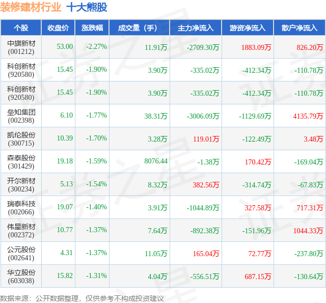 个股表现方面,装修建材行业当日领跌股为中旗新材(001212),该股当日报收53.0,下跌2.27%,成交量11.91万,主力资金净流出2709.3万元。科创新材(920580)以下跌1.9%紧随其后,该股当日成交量3.9万,主力资金净流出335.02万元。除此之外,科创新材(920580)、垒知集团(002398)、凯伦股份(300715)均进入当日熊股之列。具体个股列表见下表: