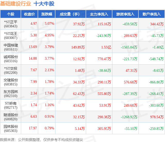 个股表现方面,基础建设行业当日领涨股为*ST正平(603843),该股当日报收4.97,上涨5.07%,成交量37.92万,主力资金净流入115.16万元。*ST花王(603007)以上涨4.95%紧随其后,该股当日成交量22.25万,主力资金净流出243.9万元。除此之外,中国核建(601611)、诚邦股份(603316)、*ST交投(002200)均进入当日牛股之列。具体个股列表见下表: