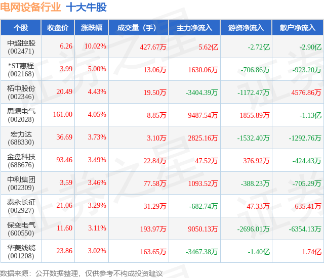 个股表现方面,电网设备行业当日领涨股为中超控股(002471),该股当日报收6.26,上涨10.02%,成交量427.67万,主力资金净流入5.62亿元。*ST惠程(002168)以上涨5.0%紧随其后,该股当日成交量13.06万,主力资金净流入1630.06万元。除此之外,柘中股份(002346)、思源电气(002028)、宏力达(688330)均进入当日牛股之列。具体个股列表见下表: