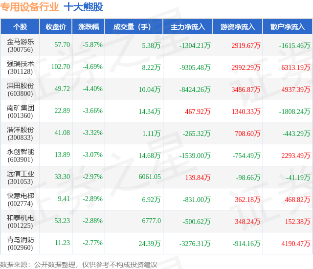 个股表现方面,专用设备行业当日领跌股为金马游乐(300756),该股当日报收57.7,下跌5.87%,成交量5.38万,主力资金净流出1304.21万元。强瑞技术(301128)以下跌4.69%紧随其后,该股当日成交量8.22万,主力资金净流出9305.48万元。除此之外,洪田股份(603800)、南矿集团(001360)、浩洋股份(300833)均进入当日熊股之列。具体个股列表见下表: