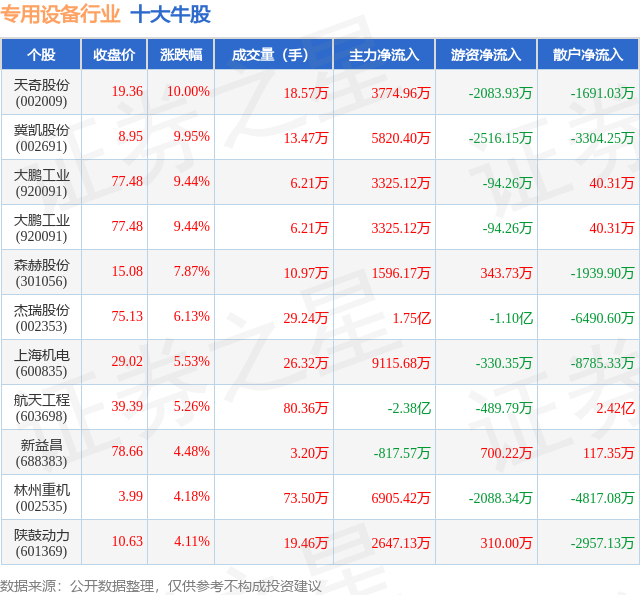个股表现方面,专用设备行业当日领涨股为天奇股份(002009),该股当日报收19.36,上涨10.0%,成交量18.57万,主力资金净流入3774.96万元。冀凯股份(002691)以上涨9.95%紧随其后,该股当日成交量13.47万,主力资金净流入5820.4万元。除此之外,大鹏工业(920091)、大鹏工业(920091)、森赫股份(301056)均进入当日牛股之列。具体个股列表见下表: