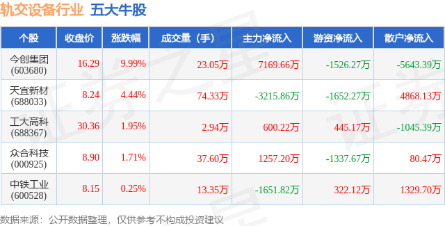个股表现方面,轨交设备行业当日领涨股为今创集团(603680),该股当日报收16.29,上涨9.99%,成交量23.05万,主力资金净流入7169.66万元。天宜新材(688033)以上涨4.44%紧随其后,该股当日成交量74.33万,主力资金净流出3215.86万元。除此之外,工大高科(688367)、众合科技(000925)、中铁工业(600528)均进入当日牛股之列。具体个股列表见下表: