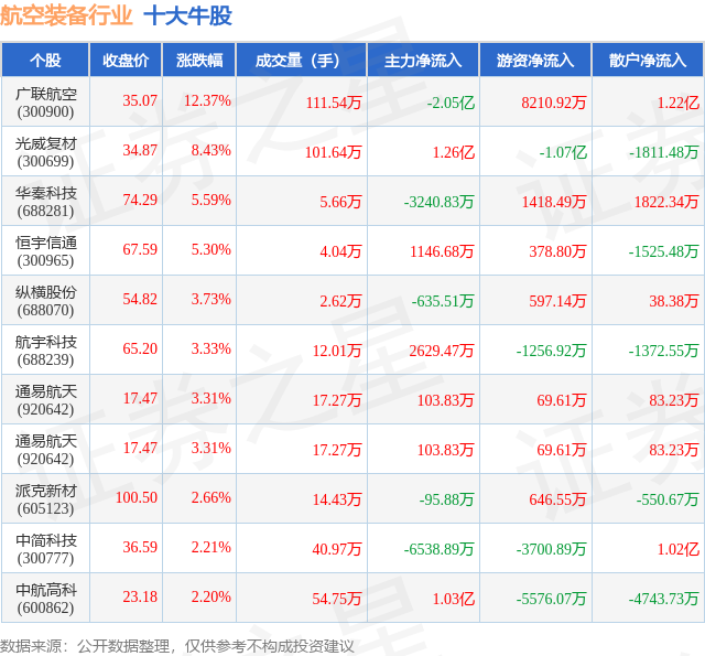 个股表现方面,航空装备行业当日领涨股为广联航空(300900),该股当日报收35.07,上涨12.37%,成交量111.54万,主力资金净流出2.05亿元。光威复材(300699)以上涨8.43%紧随其后,该股当日成交量101.64万,主力资金净流入1.26亿元。除此之外,华秦科技(688281)、恒宇信通(300965)、纵横股份(688070)均进入当日牛股之列。具体个股列表见下表: